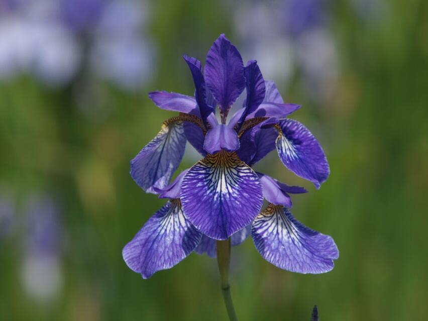 Die Gattung Iris umfasst in Mitteleuropa 11 Arten, unter ihnen die berühmte Bartiris. Das einkeimblättrige, lilienartige Gewächs bildet ansehnliche Rhizom-Horste aus, die Blütezeit liegt je nach Standort zwischen Mai und Juni. Bereits 1977 schrieb Loki Schmidt über die Sibirische Schwertlilie in einem Zeitungsartikel: "Diese schöne grazile Iris habe ich leider noch nie als Wildpflanze gesehen. Dafür kann ich sie jedes Jahr im Mai in üppiger Fülle in meinem Garten genießen. Ich freue mich an den schlanken, manchmal fast ein Meter hohen Pflanzen mit ihren grasartigen Blättern. Aus den rotbraunen Knospen kommen die hellblauen Blütenblätter mit all den dunkelblauen Adern. Die drei inneren Blütenblätter sind etwas dunkler als die äußeren. Und so schwebt dann fast wie ein tropischer Schmetterling eine Symphonie in Blau über den zarten Blättern."
