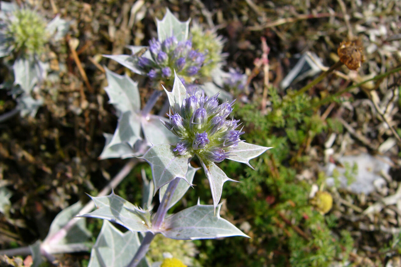Die Stranddistel, ein Doldenblütengewächs, auch unter den Namen wie Seemannstreu, Meerstrands-Mannstreu, Meerwurzel oder Meerbrackdistel bekannt, was auf ihre Popularität in früheren Zeiten hinweist, wird bis zu einem halben Meter hoch und besitzt handförmig gelappte, steife, blaugrüne Blätter, die gezahnt und dornig sind. Auch ihre fast kugeligen Blüten sind blau, ebenso die dornigen Hüllenblätter. Diese lederartig harten Blätter sind von den Standorten her nötig: der steife Küstenwind, die ständige Belastung durch den aufgewehten Sand, bilden harte Bedingungen, denen die Stranddistel gewachsen sein muss. Sie war früher in ziemlich ausgedehnten Populationen an den Nordküsten des europäischen Festlandes zu finden und so häufig, dass man, ohne ihr größeren Schaden zuzufügen, ihre Wurzeln, die darin enthaltenen Saponine, medizinisch vielfach, besonders zur lokalen Anästhesierung, zur äußerlichen Schmerzlinderung also, nutzte.