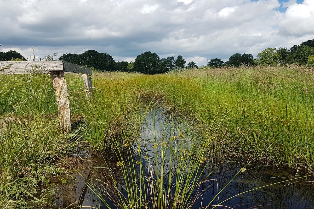 Die am Mesterbrookgraben gelegene Feuchtwiese ist mit einem Knick, diversen Gräben und einer Sumpfzone ein Zuhause für viele Tier- und Pflanzenarten.