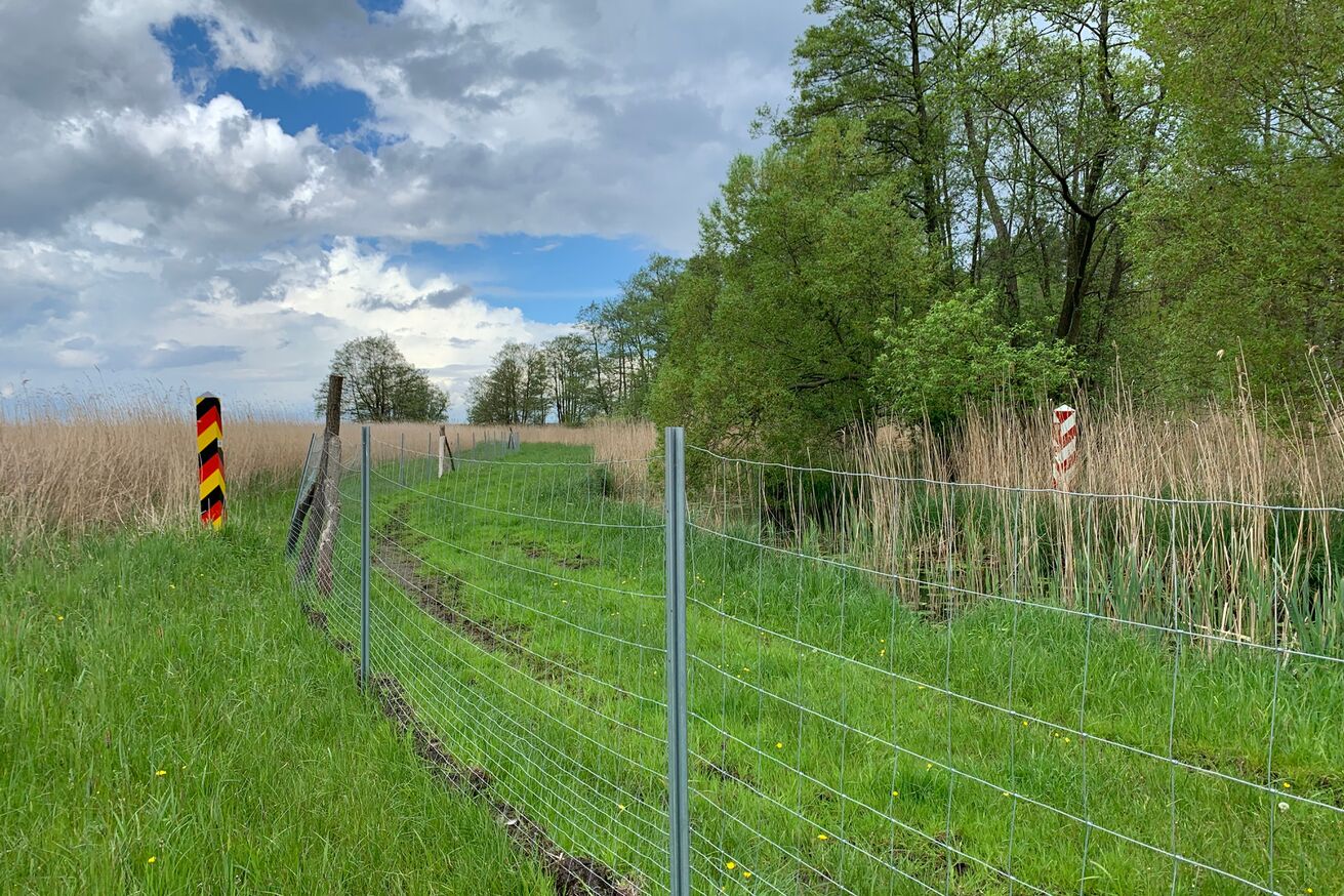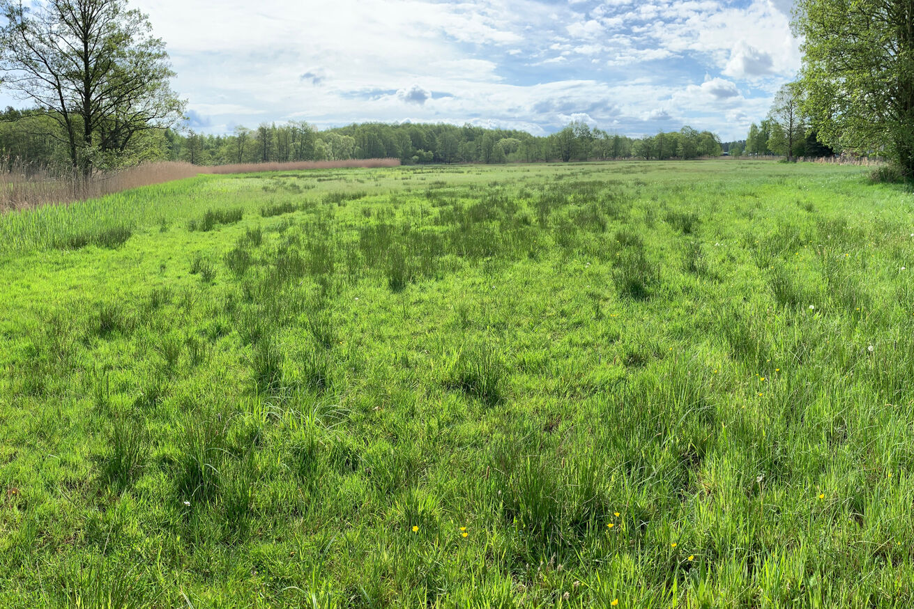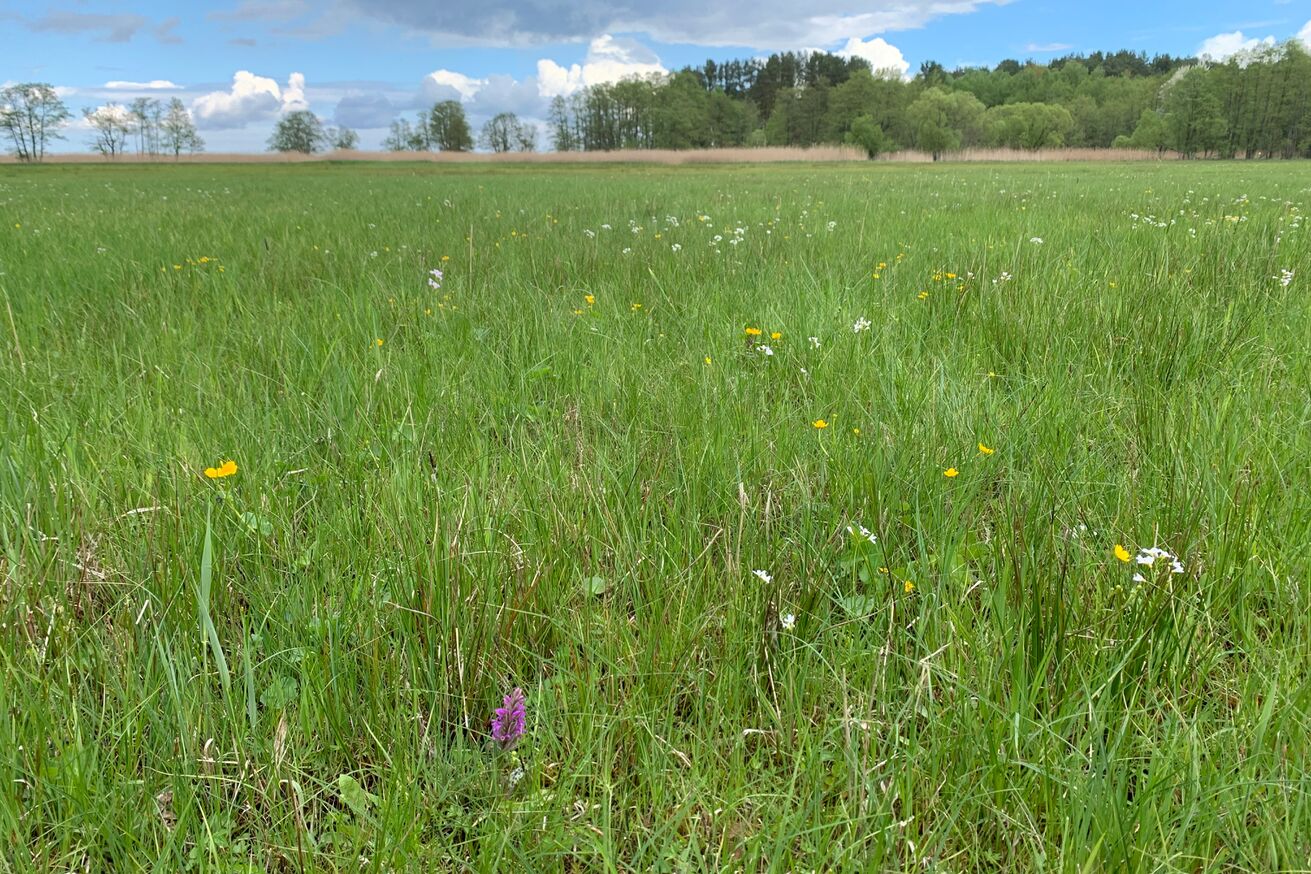 Unmittelbar an der polnischen Grenze, wo diese den Neuwarper See (eine Bucht des Stettiner Haffs) erreicht, liegt versteckt unsere seggenreiche Nasswiese. Hier blühen das Fleischfarbene und das Breitblättrige Knabenkraut, Schlangenknöterich, Schmalblättriges Wollgras und Fieberklee.